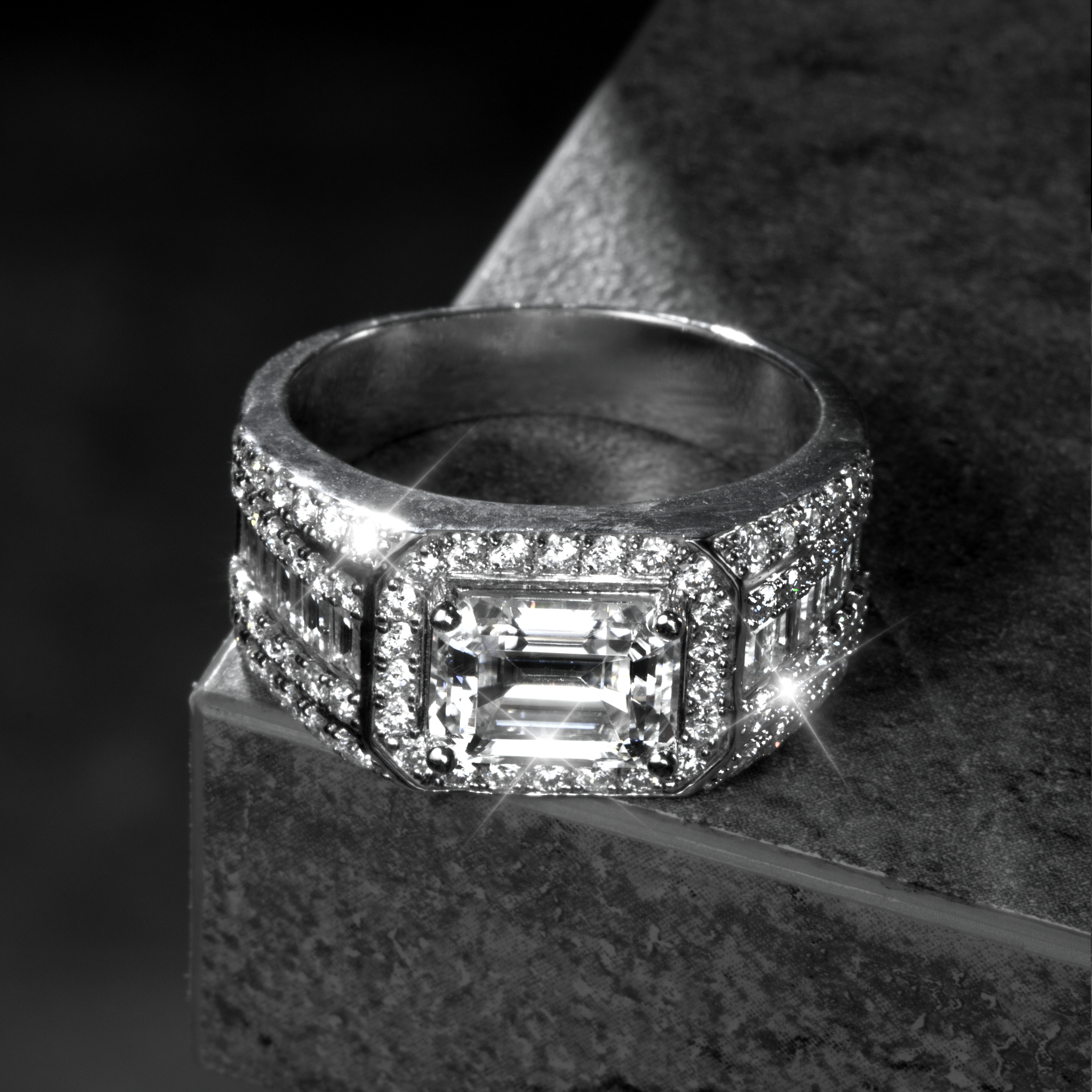 Nhẫn kim cương nam nổi bật với viên chủ Emerald cổ điển, đính kim cương tấm Round và Baguette tinh tế. Thiết kế giản lược nhưng đầy uy lực, khắc họa bản lĩnh trầm ổn và phong thái quyết đoán của quý ông dẫn đầu.